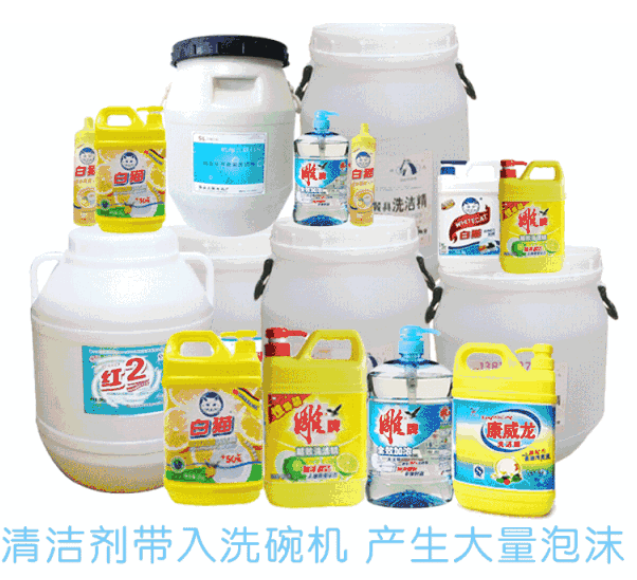 洗潔精是多種表面活性劑復(fù)合而成的清潔劑,特性是去油、去污,產(chǎn)生豐富、細膩的泡沫。在餐廳因為餐具數(shù)量太多,洗碗工如果不用花灑過水,那就會帶入大量洗潔精的稀釋液,累積起來,將是產(chǎn)生泡沫的罪魁禍?zhǔn)?。洗碗機的工作原理是:高溫,高壓,高堿,在強大的噴射水流對沖下,水槽內(nèi)一定會產(chǎn)生大量泡沫。因洗碗機清潔劑自帶去油功能,所以,在前期預(yù)處理餐具時,用少量洗潔精即可。