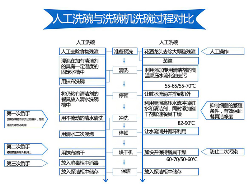 4、漂洗烘干:利用高溫凈水沖洗,使餐具表面快速干燥。